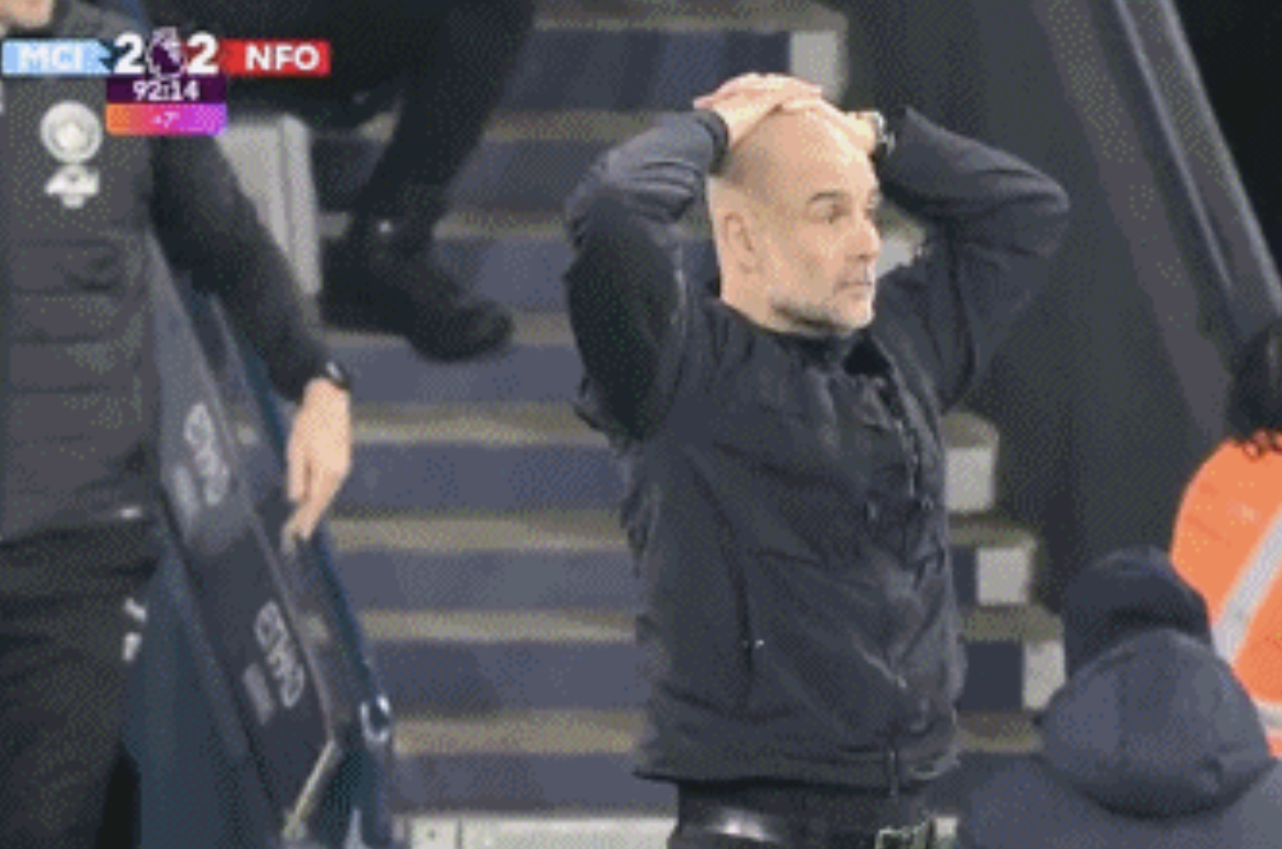 比赛最后时刻,曼城连续进攻。第93分钟,曼城在对手禁区里制造威胁,罗德里射门后被防守人踢倒在地。裁判再一次无视,拒绝给曼城点球。场边的瓜迪奥拉抱头不敢信。